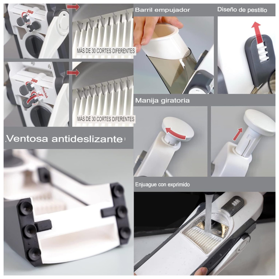 · Descubre la revolucionaria eficiencia en la preparación de alimentos con nuestro Rayador de Mandolina 3 en 1. Un completo conjunto de herramientas multifuncionales diseñadas para hacer que la cocina sea más rápida, fácil y divertida. Desde cortar cebollas hasta rayar zanahorias, este innovador conjunto hace que la preparación de alimentos sea un juego de niños.- Cuchillas Intercambiables de Acero Inoxidable: Equipado con 7 cuchillas afiladas que facilitan el corte de una variedad de alimentos, desde cebollas hasta queso y pepino.- Incluye Accesorios Útiles: Completo con 1 cesta coladora, 1 cepillo y 1 recipiente transparente, este cortador de verduras ofrece versatilidad y conveniencia en cada uso.- Cuchillas Resistentes al Óxido: La durabilidad es clave. Nuestras cuchillas no solo son afiladas, sino que también resisten el óxido, asegurando una larga vida útil del producto.- Seguro de Usar: Todas las piezas son libres de BPA y están fabricadas con plástico ABS de grado alimenticio, proporcionando seguridad. Además, cuenta con protectores de mano para resguardar tus manos durante el uso.- Fácil Limpieza: Con un cepillo de limpieza y un raspador incluidos, la limpieza es rápida, sin complicaciones. Además, todas las herramientas son aptas para lavavajillas, garantizando una limpieza eficiente.